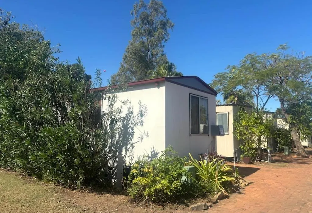 Découvrez le confort ultime dans la cuisine de ces logements Longreach Caravan And Cabin Park, équipée d'une bouilloire électrique, d'un réfrigérateur et de la vaisselle.